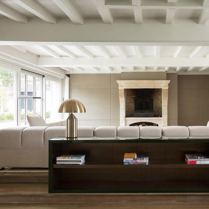 Table lamp featuring a geometric design composed of a cylindrical base and dome-shaped metal shade. Suitable for indoor use on desks, bedside tables, and living room surfaces.